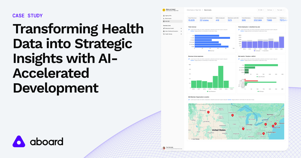 Using Aboard's AI-accelerated platform, we built the Partner Health Analytics (PHA) application– a shared data platform which surfaces key metrics and actionable insights for CBOs, and aggregates deidentified, benchmarking data to drive efficiency and impact for all partner organizations.